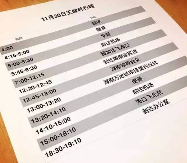 王健林作为中国首富,每天还依然很拼。万达集团在去年曾晒出一张王健林日程表:
